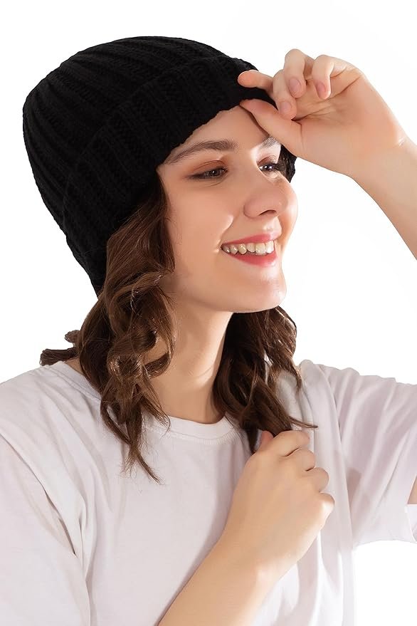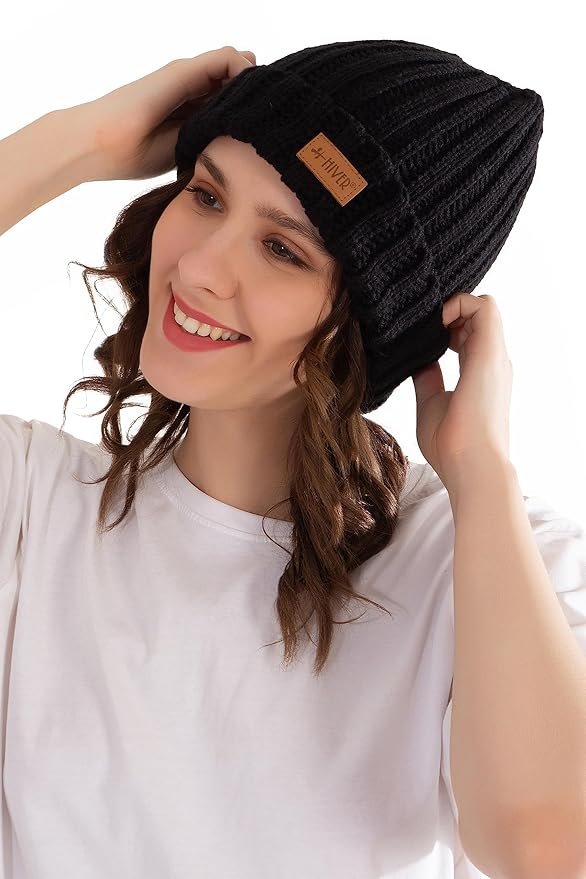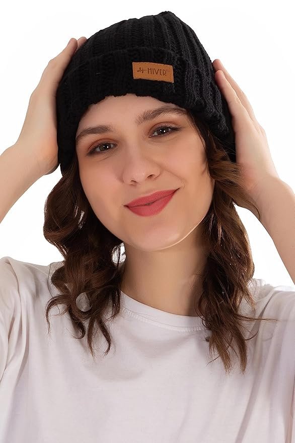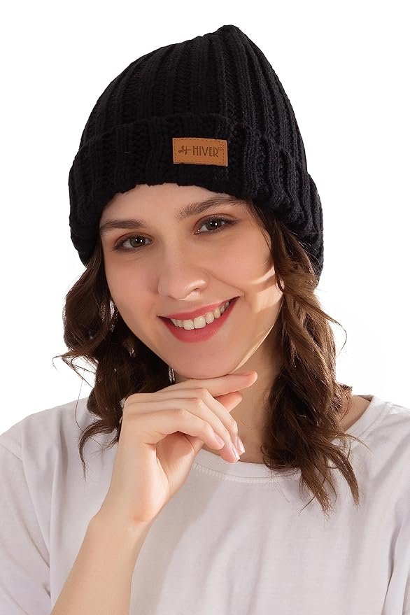 HIVER Acrylic Switz Winter Cap for Women Fleece Lined Beanie Knit Chunky Womens Snow Cap | Womens Knit Cuffed Beanie Cap Stretch Ribbed Acrylic Winter Ski Cap | Free Size