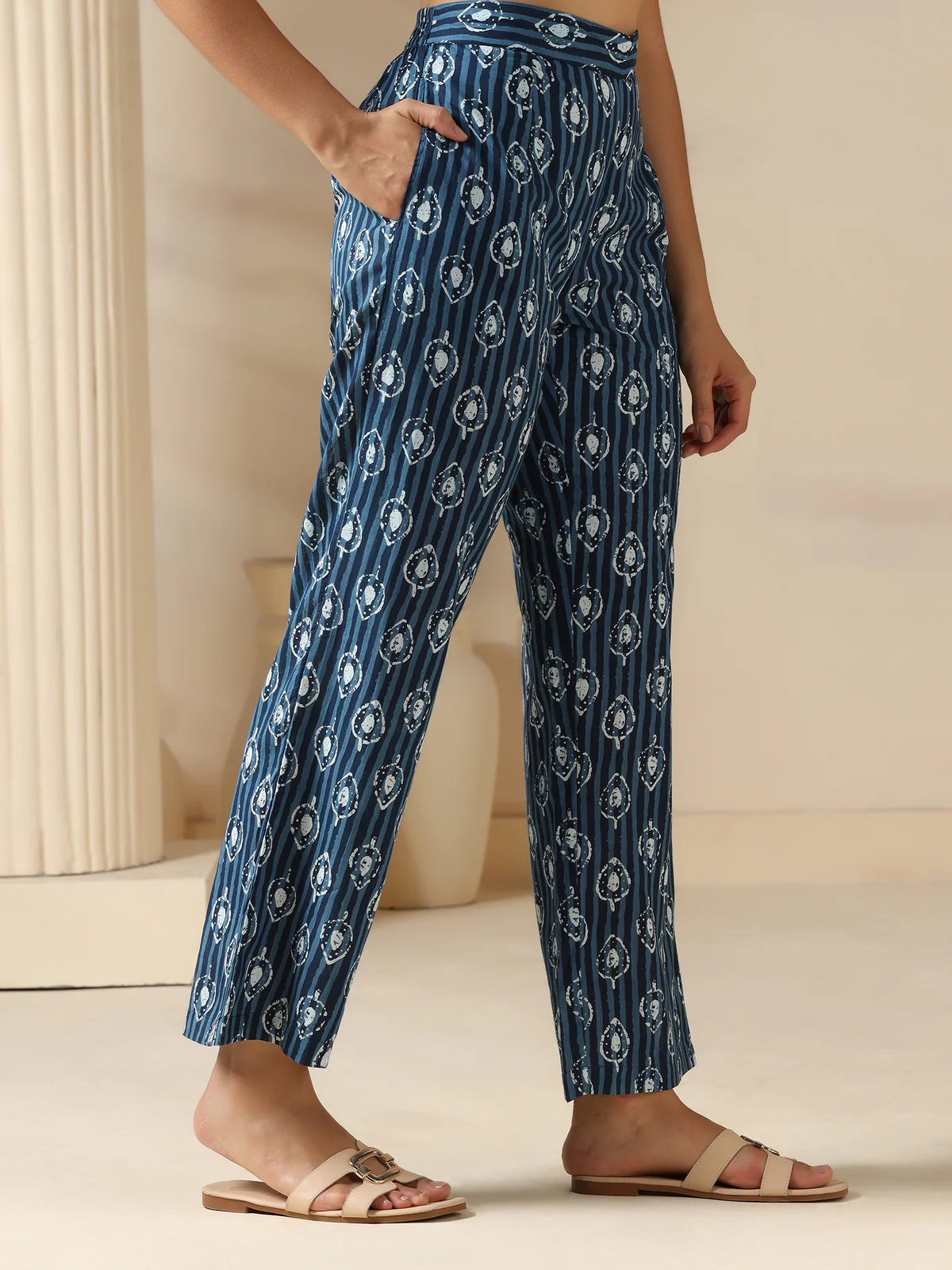 This women's co-ord set features a vibrant indigo shade enhanced by a striking geometric print, crafted from breathable cotton fabric for maximum comfort. The coordinated pieces offer a cohesive and polished look, ideal for both casual and semi-formal occasions. The natural cotton ensures breathability and ease of movement, making this set a versatile addition to any wardrobe seeking style without sacrificing comfort.